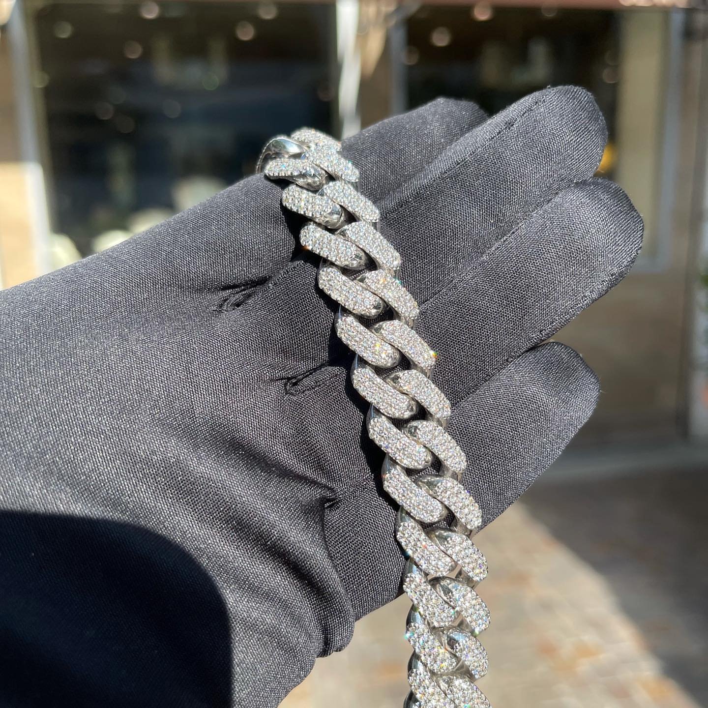 We’ve seen many examples of jewelers making lightweight versions with tiny stones. However, this is the opposite of that. Heavy, big stones and lots of shine. Put your Cuban bracelet next to this and let’s see